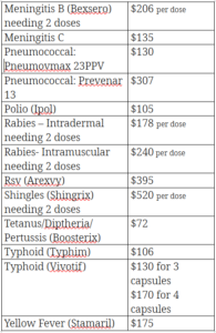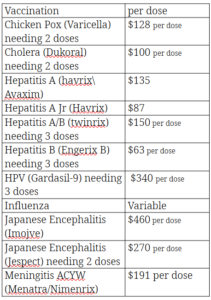 Travel consultations are from $140 upwards depending upon the complexity of the trip / number of countries to be visited and the number of people on the trip. This includes children’s appointments for children as travel is not government subsidized.